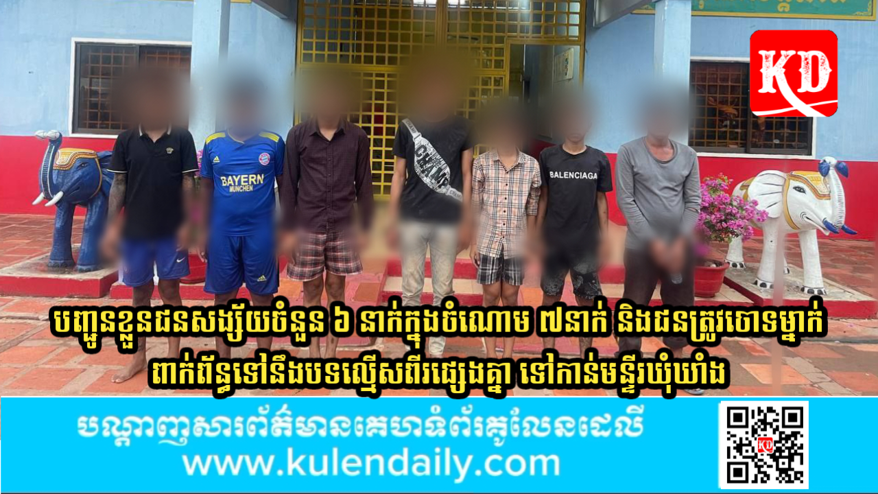 ជនសង្ស័យដែលសមត្ថកិច្ចឃាត់ខ្លួនបានមាន ចំនួន ០៧នាក់ ក្នុងនោះស្រីម្នាក់ ត្រូវបានចៅក្រមស៊ើបសួរ ចេញដីការបង្គាប់ឲ្យឃុំខ្លួនតែ ០៦នាក់ប៉ុណ្ណោះ៖១.ឈ្មោះ សុខ រ៉ាវី ភេទប្រុស អាយុ ១៨ឆ្នាំ មុខរបរៈ ដឹកម្ហូប ទីកន្លែងកំណើតភូមិសែសិន ឃុំទឹកថ្លា ស្រុកសិរីសោភ័ណ្ឌ ខេត្តបន្ទាយមានជ័យ ទីលំនៅបច្ចុប្បន្នភូមិសែសិន សង្កាត់ទឹកថ្លា ក្រុងសិរីសោភ័ណ្ឌ ខេត្តបន្ទាយមានជ័យ។