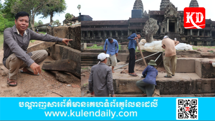 ខេត្តសៀមរាប៖ ក្រុមអ្នកជំនាញរបស់នាយកដ្ឋានអភិរក្សប្រាសាទ និងបុរាណវិទ្យា នៃអាជ្ញាធរជាតិអប្សរា កំពុងជួសជុលខឿនជណ្ដើរ និងបង្កាន់ដៃនាគជាន់ផ្ទាល់ដី ផ្នែកខាងលិចនៃជណ្តើរខាងត្បូងរបស់ប្រាសាទអង្គរវត្ត ឱ្យមានភាពរឹងមាំ និងសោភ័ណភាពឡើងវិញ។