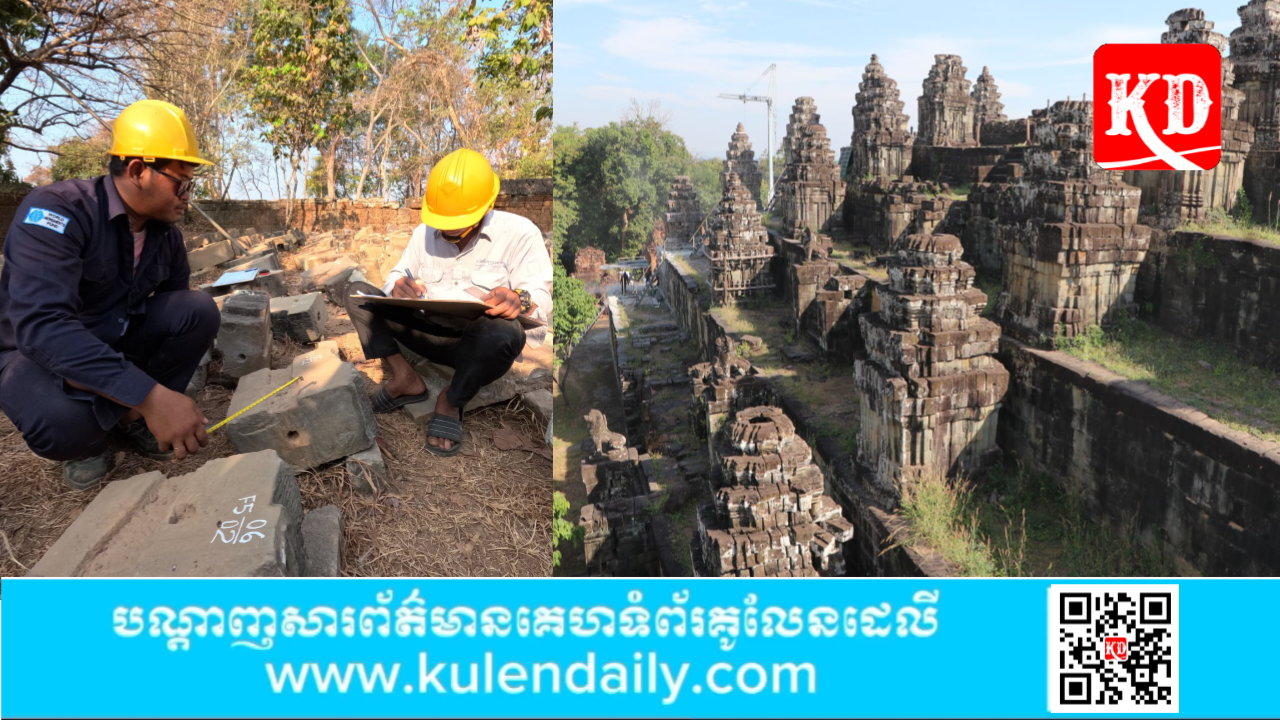 ខេត្តសៀមរាប៖ នៅការដ្ឋានជួសជុលប្រាសាទភ្នំបាខែង ក្រុមអ្នកជំនាញស្វែងរកថ្មប្រមាណ១០នាក់ រួមគ្នាប្រឹងប្រែងស្វែងរកថ្មទាំងនៅតាមបរិវេណប្រាសាទ និងនៅក្នុងព្រៃនៃជម្រាលភ្នំ ដើម្បីយកថ្មដែលចល័ចខុសពីតាំងដើមទាំងនោះមកជួសជុល និងរៀបចំផ្គុំនៅទីតាំងដើមឡើងវិញ។